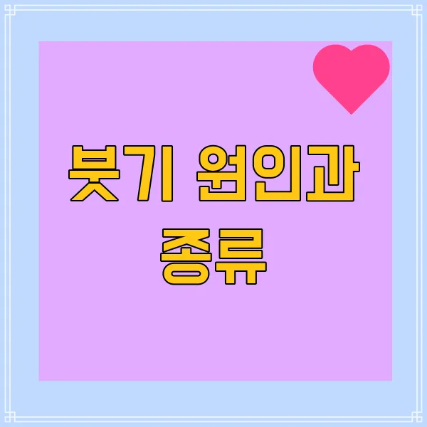 붓기의 종류는 여러 가지가 있습니다. 일반적으로 전신 부종, 즉 몸 전체에 생기는 부종과 국소 부종, 특정 부위에만 생기는 부종으로 나뉘어요. 특히 발목이나 손목, 얼굴 등에 자주 생기는 부종은 생활 습관과 밀접한 관련이 있답니다. 또, 알레르기로 인한 부종은 피부가 붉어지거나 가려움증을 동반하기도 해요.